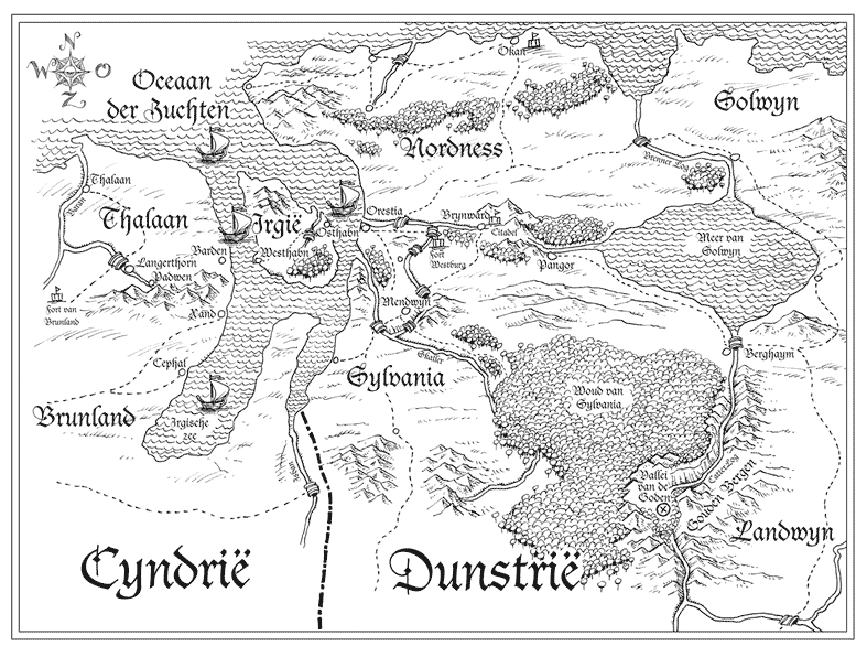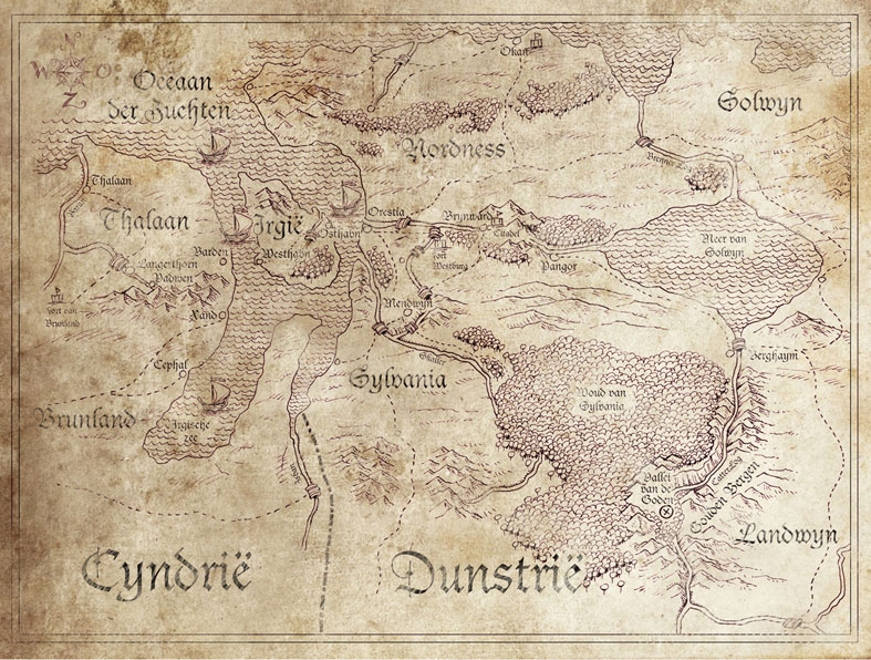Again I was asked to draw the map on the inside of the cover. For fun I did a color version which looks well-used. Upon seeing that version the publisher decided to use it in greytones and enhanced with the original version. So another hybrid was made.