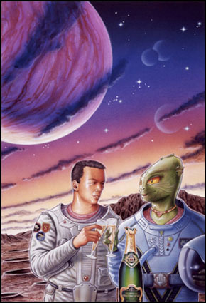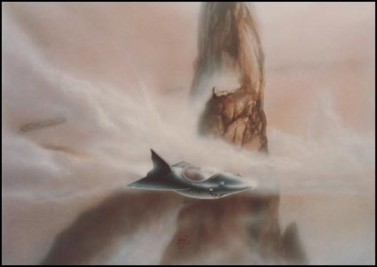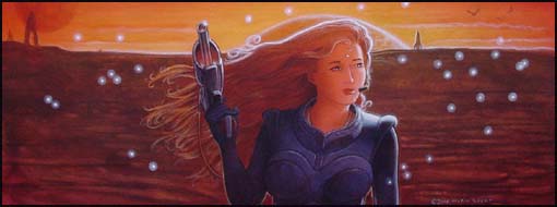 Private commission. The only brief was to have it be a strong horizontal piece! Nice assignment huh? I wanted a desolate landscape where the girl is checking out the surroundings after landing on an earth-like planet. On her way she's surrounded by -eh ...well, you figure it out!